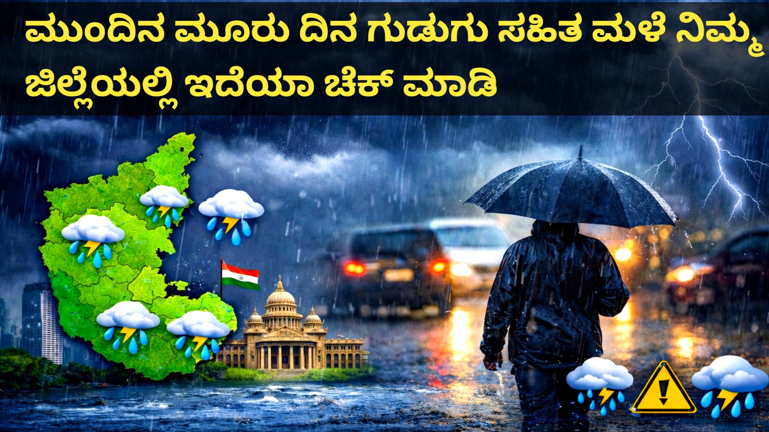 ಬೀದರ್, ಕಲಬುರಗಿ, ಯಾದಗಿರಿ, ಕೊಪ್ಪಳ, ರಾಯಚೂರು, ವಿಜಯಪುರ, ಬಳ್ಳಾರಿ, ಚಿಕ್ಕಬಳ್ಳಾಪುರ, ತುಮಕೂರು, ಚಿತ್ರದುರ್ಗ, ಬೆಂಗಳೂರು ಗ್ರಾಮಾಂತರ, ಬೆಂಗಳೂರು ನಗರ, ರಾಮನಗರ, ಕೋಲಾರ ಜಿಲ್ಲೆಗಳಲ್ಲಿ ಕೆಲವು ಸ್ಥಳಗಳಲ್ಲಿ ಗಾಳಿಯೊಂದಿಗೆ ಹಗುರದಿಂದ ಮಳೆಯಾಗಲಿದೆ. ಪ್ರತಿ ಗಂಟೆಗೆ 30-40 ಕಿ.ಮೀ ವೇಗದಲ್ಲಿ ಗಾಳಿ ಬೀಸಲಿದೆ. ಗುಡುಗು ಸಹಿತ ಮಳೆಯಾಗುವ ಸಾಧ್ಯತೆಯಿದೆ.